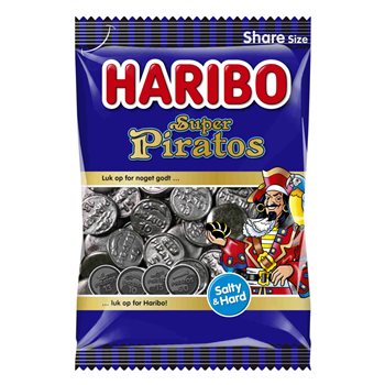 Super Piratos fra Haribo er runde, hårde og ekstra stærke lakridsdukater. Smagen er pænt salt med et strejf af Salmiak, og de varer længe i munden. Super Piratos er en klar favorit hos alle lakridselskere. Ikke egnet til børn.