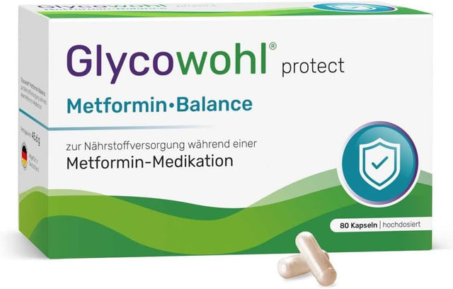 GLYCOWOHL Metformin Balance Nährstoffversorg.Kaps. (Packungsgröße: 80 stk) ist ein veganer Nährstoffkomplex mit elf wichtigen Inhaltsstoffen. Das Produkt wurde dazu entwickelt, die Mikronährstoffversorgung während der Einnahme von Metformin zu unterstützen. Diabetiker, die als Begleittherapie Metformin anwenden, haben oft mit gastroentrologischen Nebenwirkungen wie Übelkeit, Erbrechen und Durchfall zu kämpfen. Genrell führen Defizite des Nährstoffhaushaltes meist zu unerwünschten Arzneimittelwirkungen. Dafür wurde GLYCOWOHL Metformin Balance Nährstoffversorg.Kaps. (Packungsgröße: 80 stk) entwickelt. Dieser hochdosierte Nährstoffkomplex wird zusätzlich zur Metformin-Medikation eingenommen. GLYCOWOHL Metformin Balance Nährstoffversorg.Kaps. (Packungsgröße: 80 stk) beinhaltet Vitamine, Mineralstoffe, Spurenelemente und Pflanzenextrakte von höchster Qualität und Reinheit.