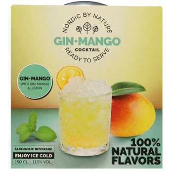 Gin-Mango from Nordic By Nature is a ready-to-serve cocktail that should be enjoyed ice-cold with fresh mint leaves. There is for approx. 12 glasses in the package. Gin-Mango consists of gin, mango syrup and lemon juice. Contains only natural flavors