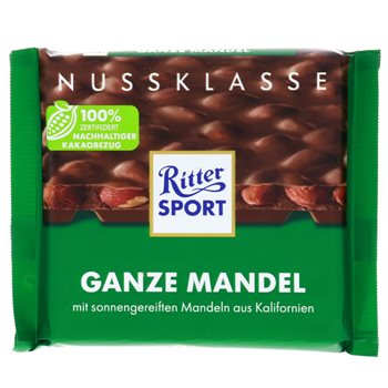 Ritter Sport Milk with whole almonds is the sister of the classic with whole nuts. In this variant, you get whole, hand-sorted almonds from California. The almonds are roasted to go in perfect harmony with the well-known top quality milk chocolate. Contains 100 g.