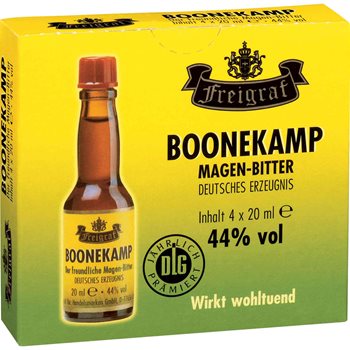 Boonekamp Bitter è un amaro di origine tedesca. Questo tipo di amaro è noto come pick-me-up mattutino o come antipasto, per il quale Boonekamp può sicuramente essere usato. Tuttavia, questo amaro può essere utilizzato anche per altri scopi. Questo amaro è realizzato secondo una ricetta tedesca e mira anche ad alleviare i dolori allo stomaco e può anche aiutare se si verificano problemi con la digestione. Un amaro secco con una bella pienezza morbida. Qui lo prendi in un branco di 4 piccole bottiglie di 20 ml.