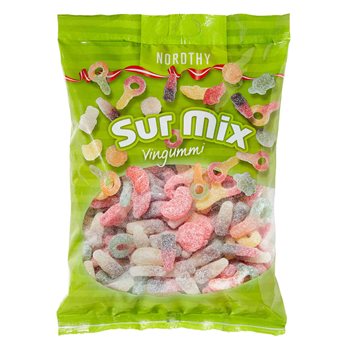 Nordthy Sur Mix sono gengive di vino morbide e acide ricoperte di zucchero. Le gengive di vino colorate sono I.A. A forma di ciucini, bottiglie di cola e frutta e la combinazione di gomma da vino acida e dolce dà l'espressione di sapore molto speciale. Un delizioso mix sia per giovani che per il pacchetto di famiglia di 900 grammi c'è abbastanza per tutti.