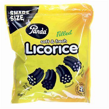 La borsa gialla con liquirizia da panda è piena di liquirizia con diversi tipi di ripieno di sapore. C'è liquirizia con un riempimento di cioccolato, caramello, sapore di banana e sapore di fragola. Enorme borsa con 500 grammi.