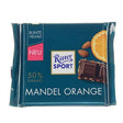 Prova una nuova versione eccitante e gustosa di Ritter Sport con all'arancia di mandorle. Il cioccolato fondente contiene almeno il 50% di cacao, che dà un'amarezza che si armonizza bene con i piccoli pezzi croccanti di mandorle e arancione.