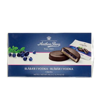 Anthon Berg Blåbär i vodka är små, delikata marzipan -tårtor gjorda av mjuk marzipan av bästa kvalitet. Tarts har en välsmakande fyllning av vilda blåbär i kombination med den finaste vodka, och de är belagda med en intensiv mörk choklad. Tarts är individuellt lindade och ser bra ut på alla soffbord för ett festligt tillfälle.